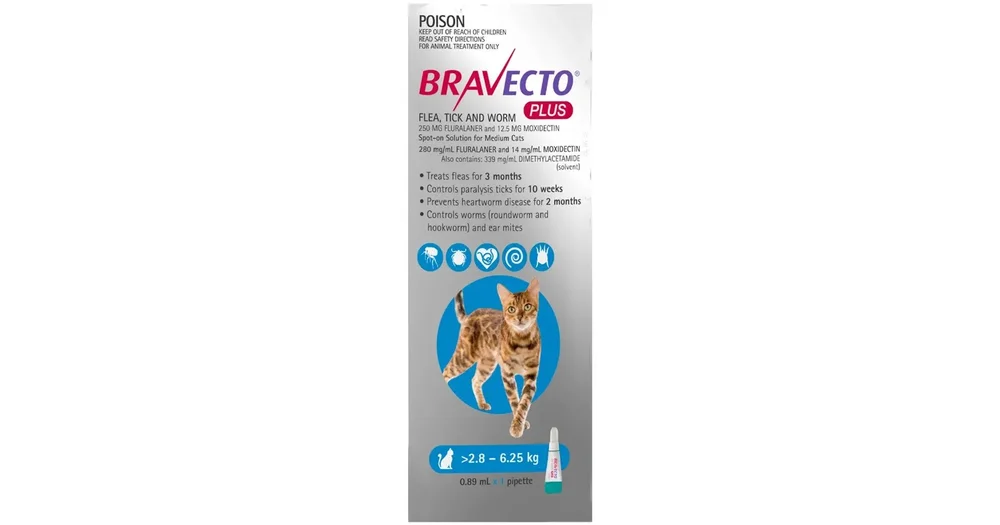 Diabetes in Dogs and Cats. Bravecto PLUS FleaTick Worm Spot-On for Cats Medium 28kg- 625kg Special Price 4990 6299. Offer available until 31th October 2022 or while stocks last to veterinary practices only.